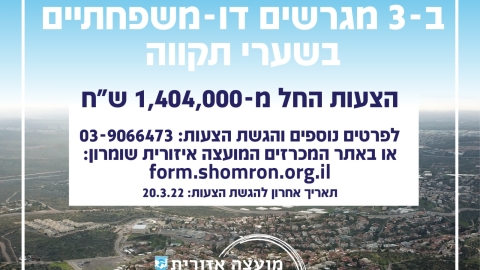 מכרז פומבי מס' 22/4 לרכישת זכויות חכירה מהוונות ב-3 מגרשים דו -משפחתיים (4 יח"ד) בישוב שערי תקווה