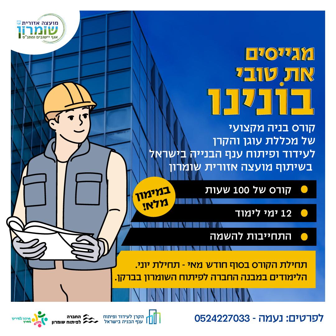 קורס של 100 שעות, מתחיל בשבועיים הקרובים בברקן. הקורס במימון מלא ובסופו תעודה והשמה. בואו לקחת חלק בעשייה ציונית הרשמה בקובץ המצורף