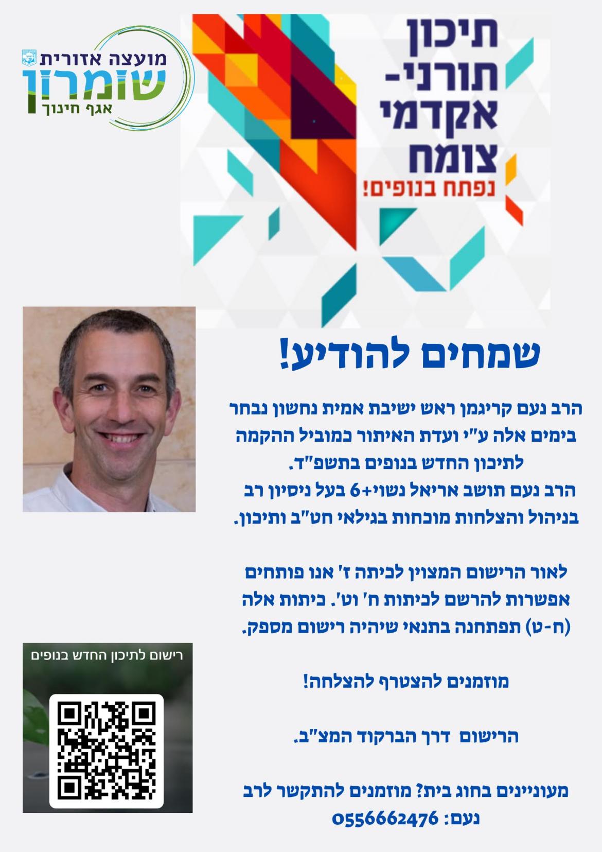 בשעה טובה! נבחר מנהל לתיכון התורני-אקדמי החדש בנופים, ההרשמה לכיתות ז-ח בעיצומה