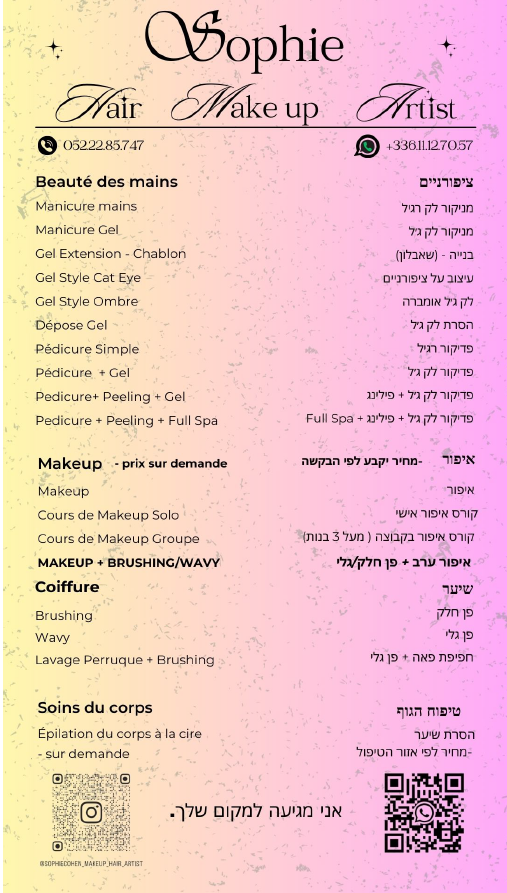 עליתי לארץ באוגוסט 2022. אני קוסמטיקאית בוגרת בית הספר הגדול ביותר בפריז כבר 18 שנים. אני אוהבת לטפל בנשים, להרגיע אותן ולהפוך אותן ליפות עוד יותר.