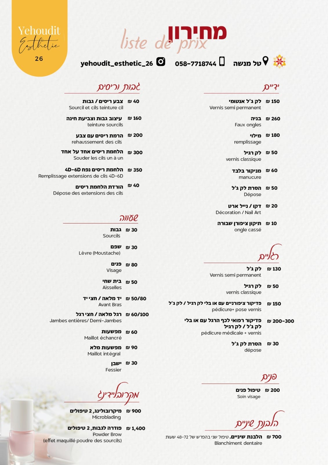 שמי יהודית בורגד, ואני קוסמטיקאית מנוסה עם ניסיון עשיר בתחום היופי והטיפולים האסתטיים. לפני מספר חודשים עליתי לארץ מדרום צרפת, שם ניהלתי בהצלחה סלון יופי פרטי. במהלך השנים צברתי ניסיון רב בתחומים שונים, ואני מתמחה במגוון טיפולים מקצועיים ואיכותיים: אפילציה, הסרת שיער, מיקרובליידינג, פדיקור ומניקור רפואי, ריסים וקעקועים, וכן טיפולי פנים. אני שואפת להעניק ללקוחותיי את השירות הטוב ביותר, תוך שמירה על מקצועיות, הקשבה אישית והתאמה לצרכים האישיים של כל אחד ואחת. אני מזמינה אתכם להגיע ולטפל בעצמכם, לקבל חווית טיפול איכותית ומרגיעה, ולחוות את המומחיות שלי בתחום.