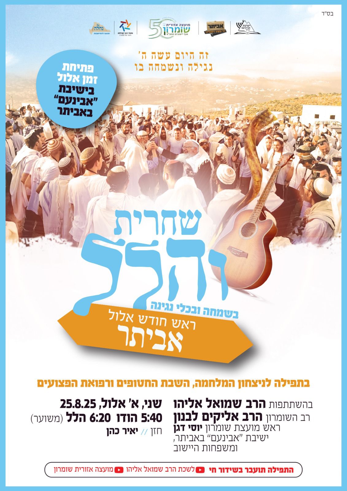 הוסף ללוח שנה 2025-08-25 05:40:00 2025-08-25 00:00:00 Asia/Jerusalem תפילת שחרית והלל עם הרב שמואל אליהו - ר"ח אלול למידע מלא: https://www.shomron.org.il/events/510/ אביתר, ישיבת אבינעם