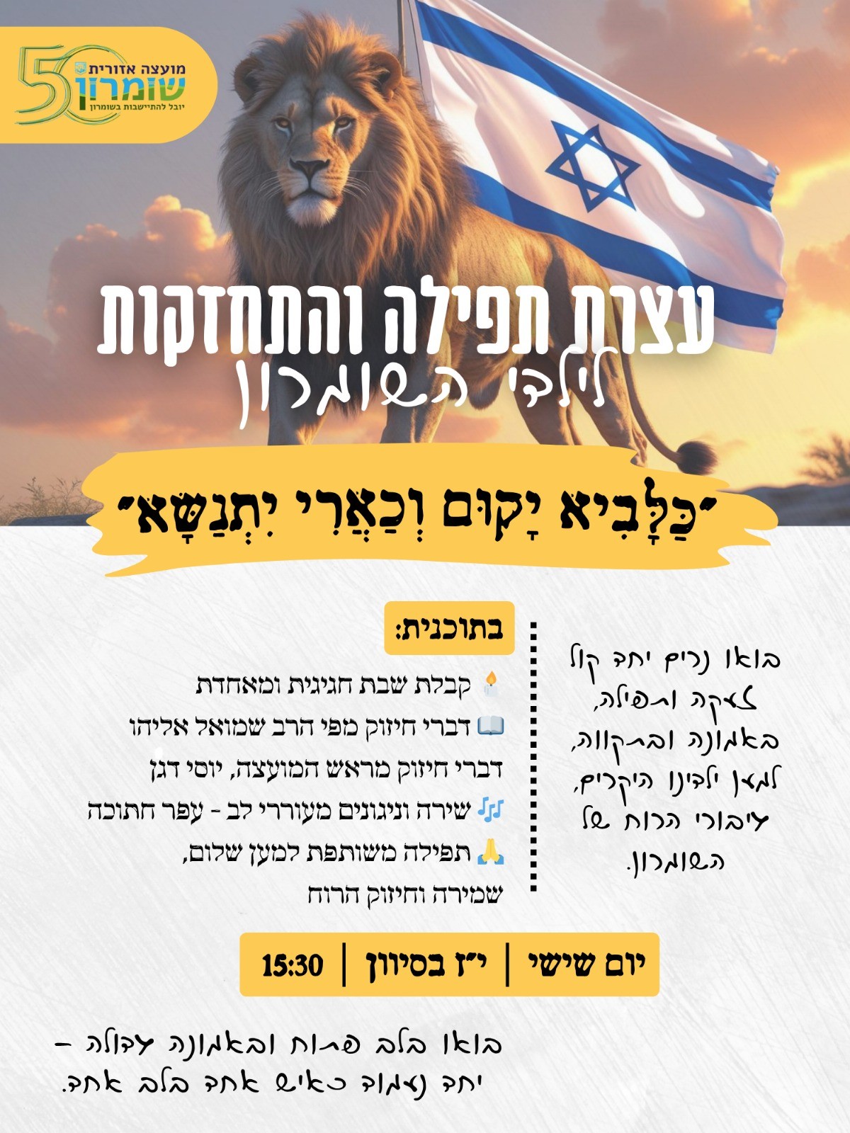 ילדי השומרון המתוקים מוזמנים יחד עם כל המשפחה, להודות על הניסים ולהרים קול זעקה ותפילה לשמירה על חיילנו ולהצלחת עמ"י!